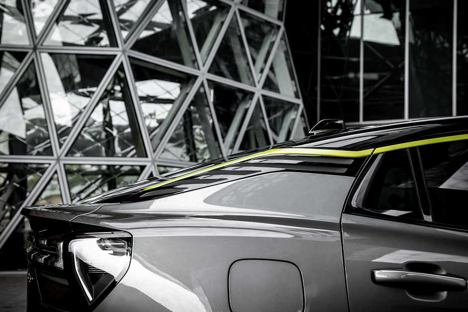 车侧是领克05最动人心魄的设计展示。车顶线条经过B柱后以黄金角度向下倾斜,营造出兼顾速度感和空间舒适性的轿跑溜背曲线。一体式暮光车顶,采用高强度塑钢和玻璃材料的设计,搭配纯黑的车顶配色,呼应了年轻用户追求酷感夜生活的都市形态,再配合大尺寸全景天窗,将领克05极致有型的风格展露无遗。极光之翼尾柱饰板,采用未来感十足的高塑钢材质,哑光与高光明暗交错、曲面肌理分明,让人形成独特的视觉印象。该设计高度呼应领克CCC概念车的设计元素,其灵感源自北欧绚丽多彩的极光光束,借以现代化的雕塑形式,更突显车身的设计感与速度感。