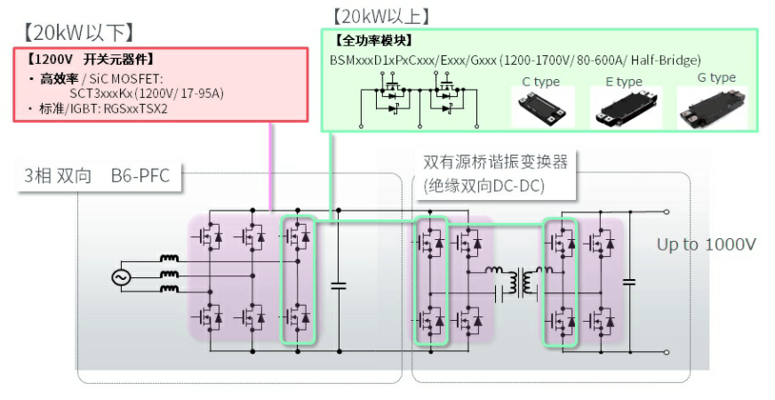 20kW以下使用1200V开关元器件,例如高效率的碳化硅MOSFET “SCT3xxxKx(1200V/17-95A)”或标准IGBT “RGSxxTSX2”。在20kW以上的应用中,可以选择全碳化硅功率模块“BSMxxxD1xPxCxxx/Exxx/Gxxx(1200-1700V/80-600A/Half-Bridge)”,实现双有源桥谐振变换器(绝缘双向DC-DC)。
