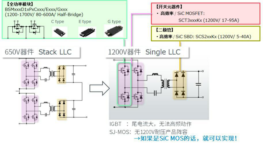 其次,对于LLC部分,罗姆通过高耐压1200V 碳化硅MOS来削减部件个数。通过将1200V 碳化硅MOS应用于LLC部分,可以将Stack型的LLC电路变更为下述Single型。具备高耐压、高速开关特点的碳化硅器件给Single LLC带来以下优点: