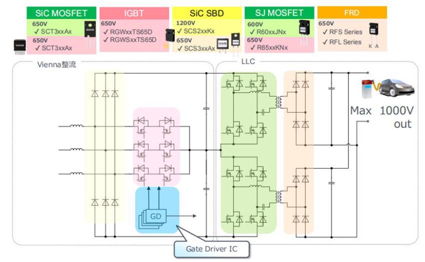 Vienna整流+LLC构成了充电桩的基本电路。如果考虑设备成本,罗姆推荐使用硅器件、FRD(快恢复二极管)方案;如果需要高功率密度和高效率,则推荐使用碳化硅 MOS/SBD方案。