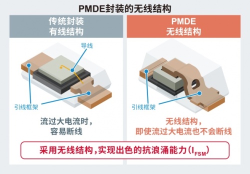 PMDE封装通过扩大其背面电极面积,增加了金属部分所占的面积,从而实现了34.8N的贴装强度,约为SOD-123FL封装的1.4倍。该优势降低了电路板承受应力时产生裂纹(产品龟裂)的风险,有助于提高可靠性。此外,通过采用将芯片直接夹在框架之间的无线结构,还实现了出色的抗浪涌电流能力(IFSM)。即使在汽车引擎启动和家电运行异常等突发大电流状况下,也不易损坏,高可靠性得到保证。