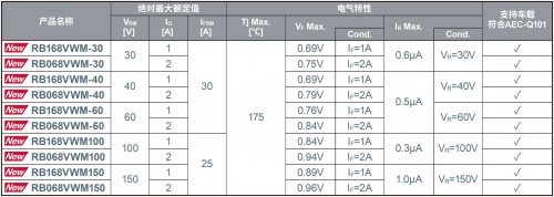 SBD是具有低VF(正向电压)*2和高效率特点的二极管。此次,具有超低IR(反向电流)*3特性、在高温环境下也能稳定运行的RBxx8系列中,又新增了10款耐压为30V~150V的PMDE封装产品。