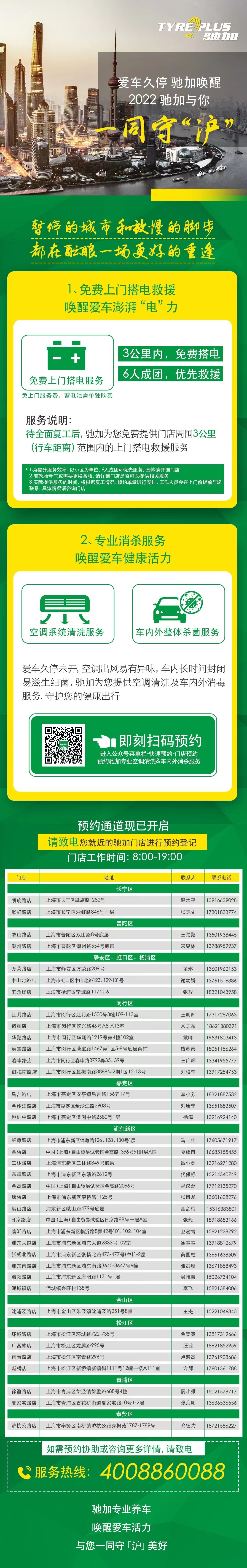 待全面复工后,上海38家驰加门店将为周围3公里范围内的居民提供免费上门救援,各门店将会根据复工和预约情况尽快安排工作人员上门服务。与此同时,驰加建议车主及时对车内状况等展开自检,如打开车窗通风,将空调风速开至最大,以缓解长时间封闭导致的细菌滋生、空调出风口异味等问题。驰加也为有需要的车主提供了一系列专业消杀服务,包括空调系统清洁、更换滤芯及车内外整体杀菌等,以打造清洁、安全、舒适的用车环境。