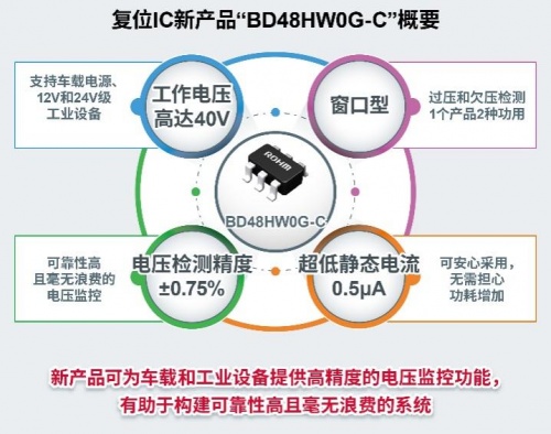 全球知名半导体制造商ROHM(总部位于日本京都市)面向需要对电子电路进行电压监控以确保安全的各种车载和工业设备应用(包括车辆引擎控制单元和FA设备),开发出具有高精度和超低静态电流的复位IC*1(电压检测器)“BD48HW0G-C”。