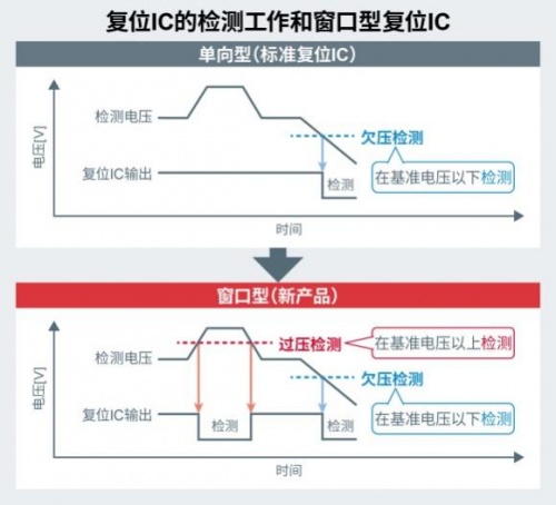 复位IC用于电子电路的电压监控,具有在超过阈值(即检测电压)时改变输出的功能,因此具有通过与微控制器合作来确保系统安全的作用。标准的复位IC只能监测单侧(过压或欠压)电压,被称为“单向型”复位IC;而窗口型复位IC则可以监测两侧的电压,因此一个产品可以发挥两种作用。