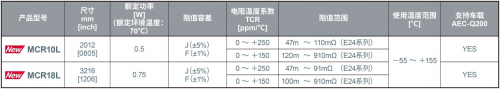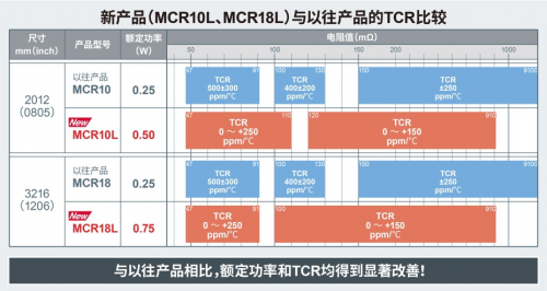MCR10L(额定功率0.5W)和MCR18L(额定功率0.75W)是MCR系列通用型低阻值机型。以往产品MCR10和MCR18的额定功率都是0.25W,相比之下,额定功率均已显著提升,TCR也得以改善。另外,此次产品更新旨在提高产品的性能,不仅改进了器件结构,还对材料进行了改良,未来可以稳定供应。