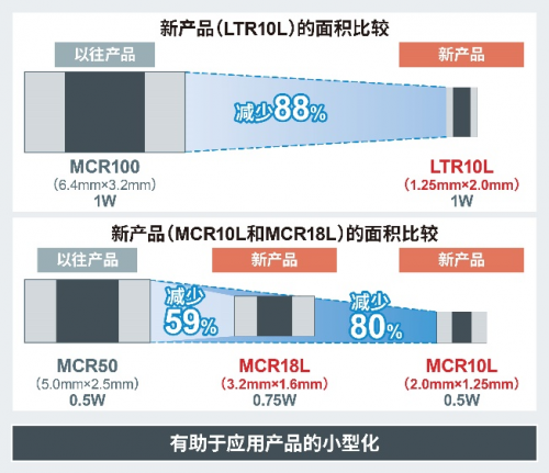 LTR10L通过改良电阻体材料并适用引脚温度降额*2,在1220尺寸(1.25mm×2.0mm)的分流电阻器中,实现了业界超高的1W额定功率,面积相比以往产品减少了88%。另外,除了在产品阵容中增加了阻值容差±0.5%级的高精度产品外,还实现了业内出色的TCR和抗硫化性能,适用于车载LED前照灯等要求高精度电流检测和长期具备高可靠性的应用,以及通信基站电源等对耐环境性能要求高的应用。除此之外,MCR10L和MCR18L是“MCR系列”通用型分流电阻器,是将以往产品MCR10和MCR18的器件结构和材料改进后的机型。与同等尺寸的以往产品相比,MCR10L的额定功率达0.5W(2倍),MCR18L的额定功率达0.75W(3倍)。新产品的额定功率都比以往产品高,并且能以更小的尺寸实现同等性能,因此有助于应用产品的小型化。