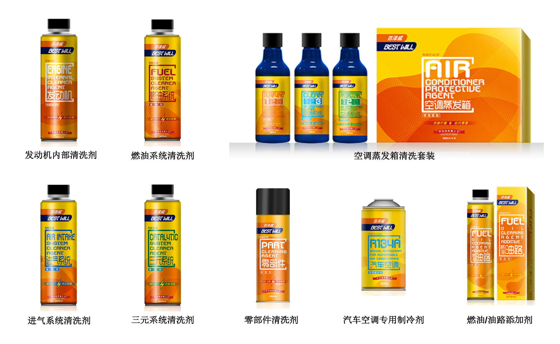 目前百泽威汽车养护用品包含以下8个类别:发动机内部清洗剂、进气系统清洗剂、空调蒸发箱清洗套装、零部件清洗剂、汽车空调专用制冷剂、燃油/油路添加剂、燃油系统清洗剂以及三元系统清洗剂,可涵盖汽车内多种零部件清洗场景和需求,高效清楚各类顽固油泥积碳。