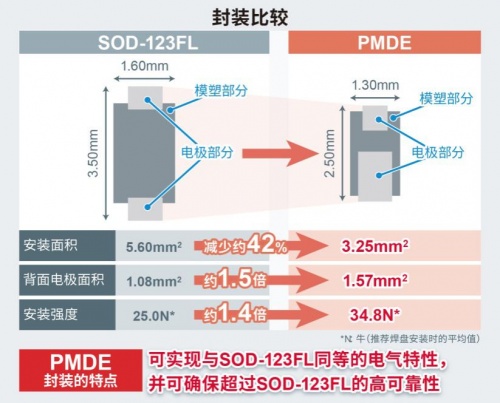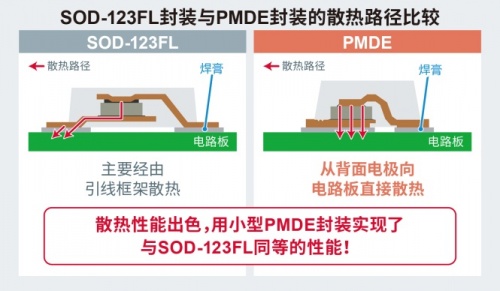 对此,PMDE封装通过扩大背面电极面积,同时改善了散热路径,将经由引线框架散热改为直接散发到电路板上。这使散热性能大幅提升,以更小的尺寸(2.5mm×1.3mm)即可实现与普通SOD-123FL封装(3.5mm×1.6mm)同等的电气特性,从而可减少约42%的安装面积,非常适合元器件安装密度不断提高的车载应用。
