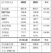 相较于2021年第一季度: 营业额: 8.576亿欧元,增长27%;按同比汇率和合并计算,增长18.7% EBITDA 利润率为17.6%,达到1.508亿欧元;EBIT 利润率为10.8%,达到9290万欧元 本季度净投资: 5990万欧元 净金融负