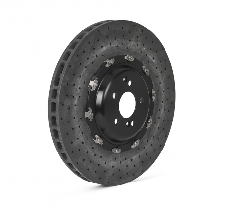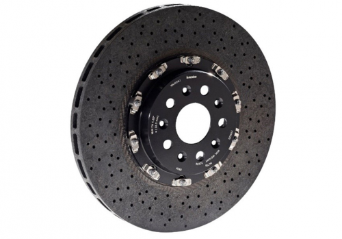 设备采用单体制动卡钳 (前轮为6活塞配置,后轮为4活塞配置),通过专门的设计方案来提升赛道极端驾驶条件下的冷却效果。后轮制动卡钳配有集成电子驻车制动器,这是由布雷博开发的解决方案,将传统的机械专业知识与新兴的电子功能结合在一起。这套系统搭配碳纤维陶瓷制动盘:前轮制动盘直径为398毫米,厚度为36毫米;后轮制动盘直径为360毫米,厚度为32毫米。从而实现绝佳的轻量和操控性,在反复多次制动之后,依然能够保持稳定的制动力。