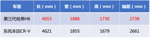 在尺寸方面,两款车都定位于紧凑型的SUV,整体车身尺寸也比较相近。不过,第三代哈弗H6在数据上要比本田CR-V大一圈,尤其是轴距足足多了77mm,整体的空间表现上也更宽敞一些。