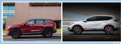 从外观设计对比,不难发现两款车都有各自的风格特色。第三代哈弗H6的前脸设计更精致、大气,采用多边形的前格栅配合两侧犀利的大灯组,更具运动气息。本田CR-V则是标准的城市SUV设计,前脸采用家族式设计,辨识度也比较不错,但整体设计略显平庸。
